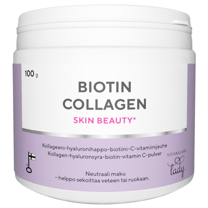Biotin Collagen Skin Beauty-pulveret innehåller kliniskt studerat Verisol® P-kollagen. Verisol® P-kollagen är typ I-kollagen som har brutits ner till mindre kollagenpeptider för att öka absorptionen. Förutom kollagenet innehåller produkten hyaluronsyra, biotin och C-vitamin. C-vitamin främjar hudens egen kollagenproduktion. Biotin bidrar till att huden förblir normal.