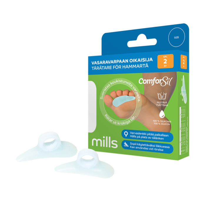 Pakkaus sisältää vasaravarpaan oikaisijan oikealle ja vasemmalle jalalle.