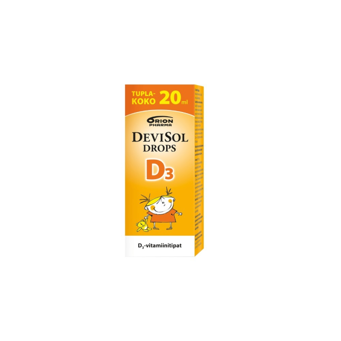 DeviSol Drops on D3-vitamiinia sisältävä öljypohjainen tippavalmiste, joka soveltuu päivittäisen D-vitamiinin saannin varmistamiseen vauvaiästä lähtien. Helppo annostella lusikalla tai sekoittaa ruokaan tai juomaan. Täysin makuaineettomat DeviSol-tipat voi sekoittaa joko kuumaan tai kylmään ruokaan tai juomaan. Ei sisällä säilöntä-, väri- tai aromiaineita. Säilyy huoneenlämmössä myös avaamisen jälkeen. Suositeltu päiväannos on 1-5 tippaa eli 2-10 mikrogrammaa. Suomessa valmistettu Avainlippu-tuote.