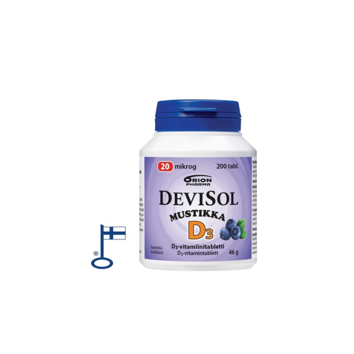 Devisol Mustikka 20 mikrog on aidon mustikan makuinen D-vitamiini puru-/imeskelytabletti. Makeutettu ksylitolilla ja sorbitolilla. Sisältää hyvin imeytyvää D3-vitamiinia. Saatavilla 200 tabl. pakkauksissa.