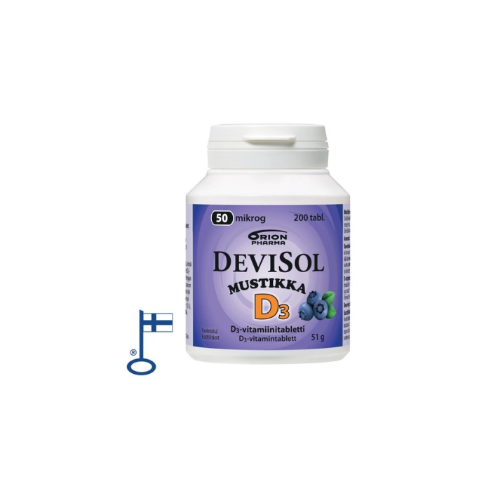 Devisol Mustikka 50 mikrog on aidon mustikan makuinen D-vitamiini puru-/imeskelytabletti. Makeutettu ksylitolilla ja sorbitolilla. Sisältää hyvin imeytyvää D3-vitamiinia. Saatavilla 200 tabl. pakkauksissa.