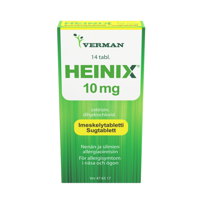 Hoidon kesto riippuu oireidesi luonteesta, kestosta ja etenemisestä. Lääkäri määrittelee hoidon keston. Älä ota kaksinkertaista annosta korvataksesi unohtamasi kerta-annoksen Jos sinulla on muita sairauksia tai yliherkkyyksiä tai jos käytät muita lääkkeitä, varmista lääkkeen sopivuus pakkausselosteesta, apteekista tai lääkäriltäsi Heinixin käyttö on lopetettava vähintään 3 päivää ennen allergiakokeita Tutustu tuotteen pakkausselosteeseen ja lue ohjeet huolellisesti ennen käyttöä