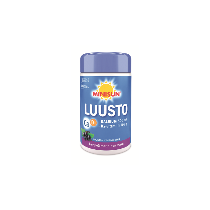 Minisun Kalsium + D₃ sisältää kalsiumia ja D₃-vitamiinia luuston hyvinvointiin. Kalsium on tärkeä luuston vahvistaja, jonka imeytymiseen tarvitaan D-vitamiinia. Lisäksi D-vitamiini vahvistaa vastustuskykyä ja on tärkeä vitamiini lihasten ja hampaiden hyvinvointiin. Minisun Kalsium + D₃ -tuotteet maistuvat hyviltä, niissä on sopiva määrä kalsiumia ja hyvin imeytyvää D₃-vitamiinia. Tuote on lempeän marjaisen makuinen, sisältää runsaasti kalsiumia (500 milligrammaa) ja 10 mikrogrammaa D₃-vitamiinia.