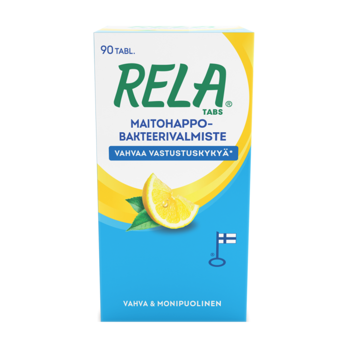 Uudistuneet Rela-maitohappobakteerivalmisteet sisältävät kahta tutkittua ja korkealaatuista bakteerikantaa (Lactobacillus rhamnosus SP1 ja Bifidobacterium lactis BLC1) ja 3 miljardia bakteeria päiväannosta kohden. Vahvaa vastustuskykyä** – Rela Tabs -tuotteet sisältävät maitohappobakteerien lisäksi C-vitamiinia, joka on tärkeä vastustuskyvyn ylläpitäjä. Hyvänmakuinen Rela Tabs Sitruuna maistuu lempeälle sitruunalle, ei sisällä sukraloosia ja sopii koko perheelle. Uudistuneet Rela-tuotteet on valmistettu Suomessa ja niillä on avainlippumerkki.